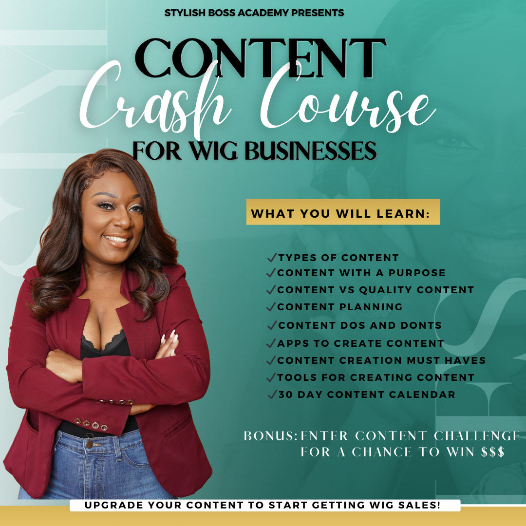 Learn how to create content to help grow and scale your wig business! I know there’s a lot of courses out there but this one I give you everything, WIG BUSINESS SPECIFIC! This is the only masterclass that teaches you EXACTLY how to create content to help grow and scale your wig business! In our masterclass replay, we'll dive into creating engaging captions, covering everything from diverse content types to figuring out the sweet spot between purpose and quality. We’ll discuss the dos and don'ts, and equip you with the essential tools to make your posts connect and convert. Get ready to elevate your social media presence and watch your wig business steal the spotlight!
